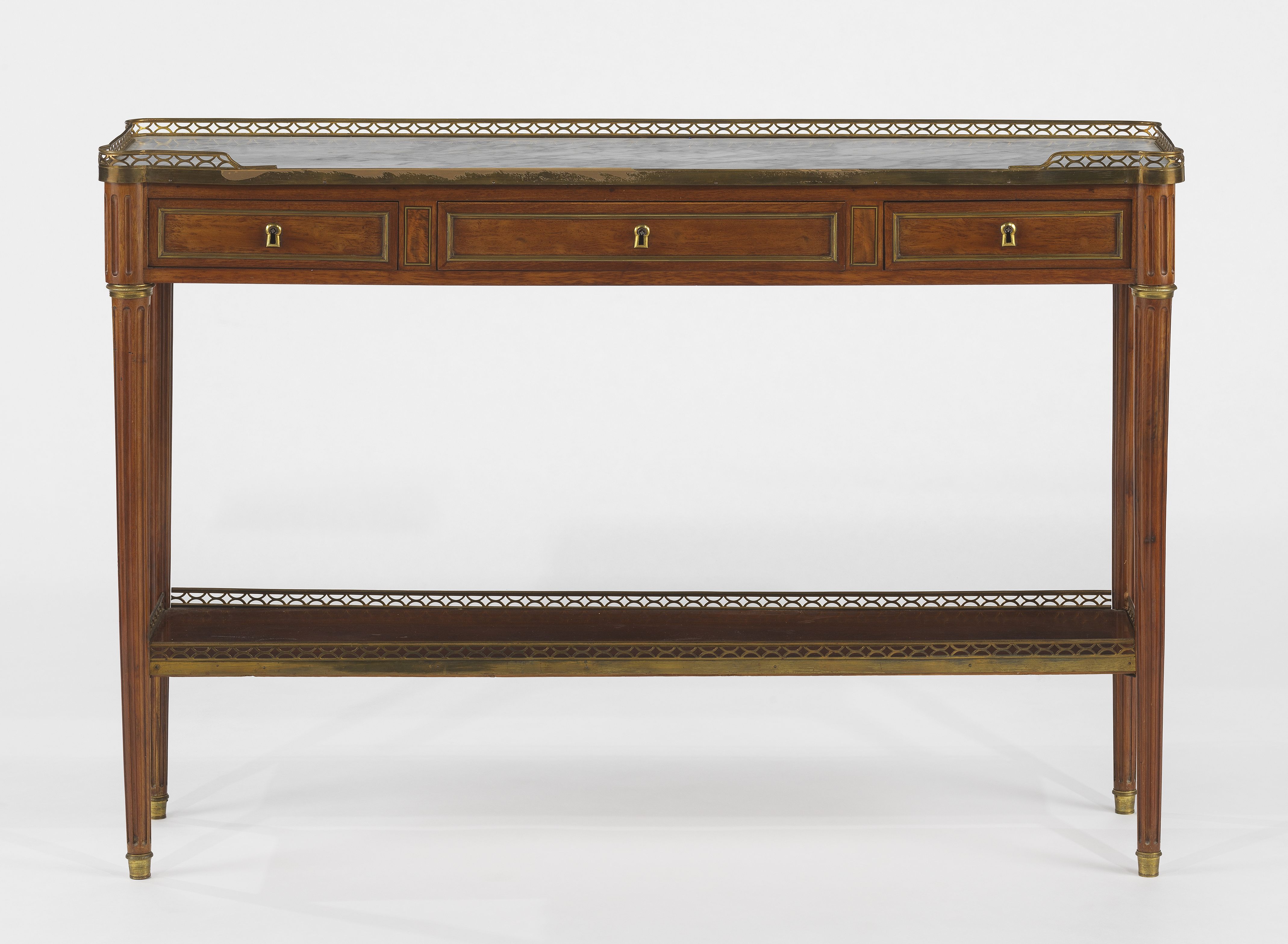 Trois tiroirs, acajou, laiton et marbre blanc, 90x131x37 cm