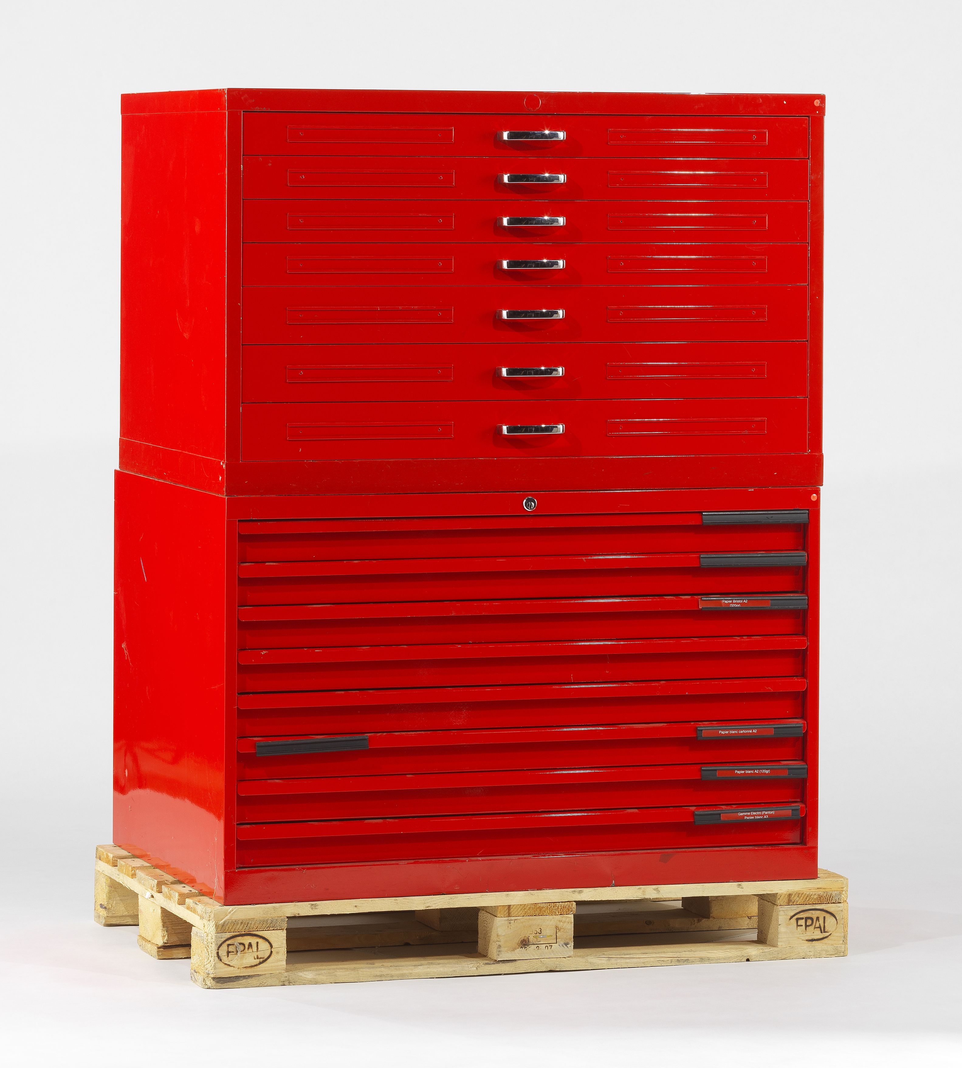 Métal laqué rouge, 7 tiroirs, 70x78x110 cm
