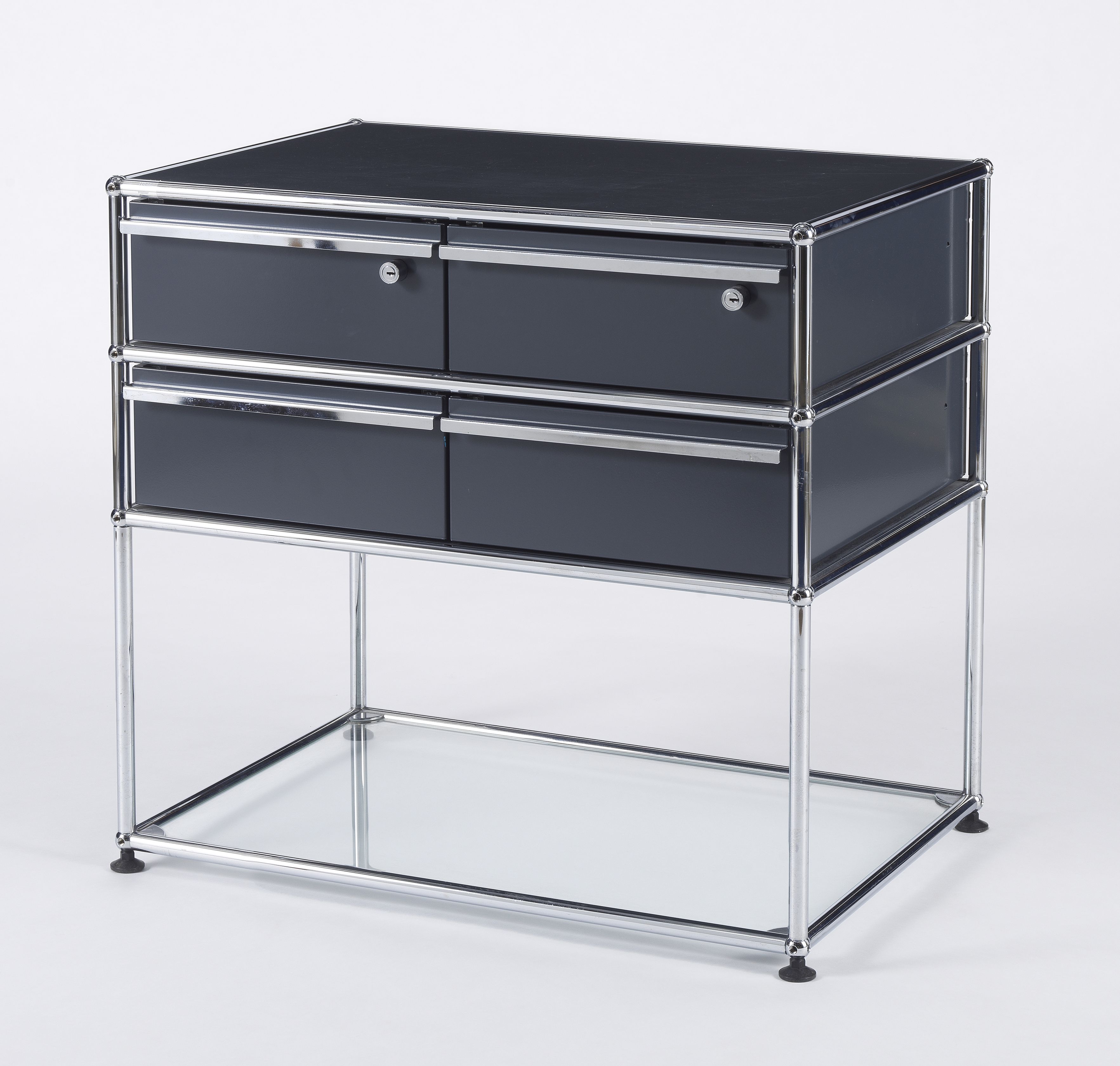 Quatre tiroirs, métal chromé et laqué gris, 75x73x52