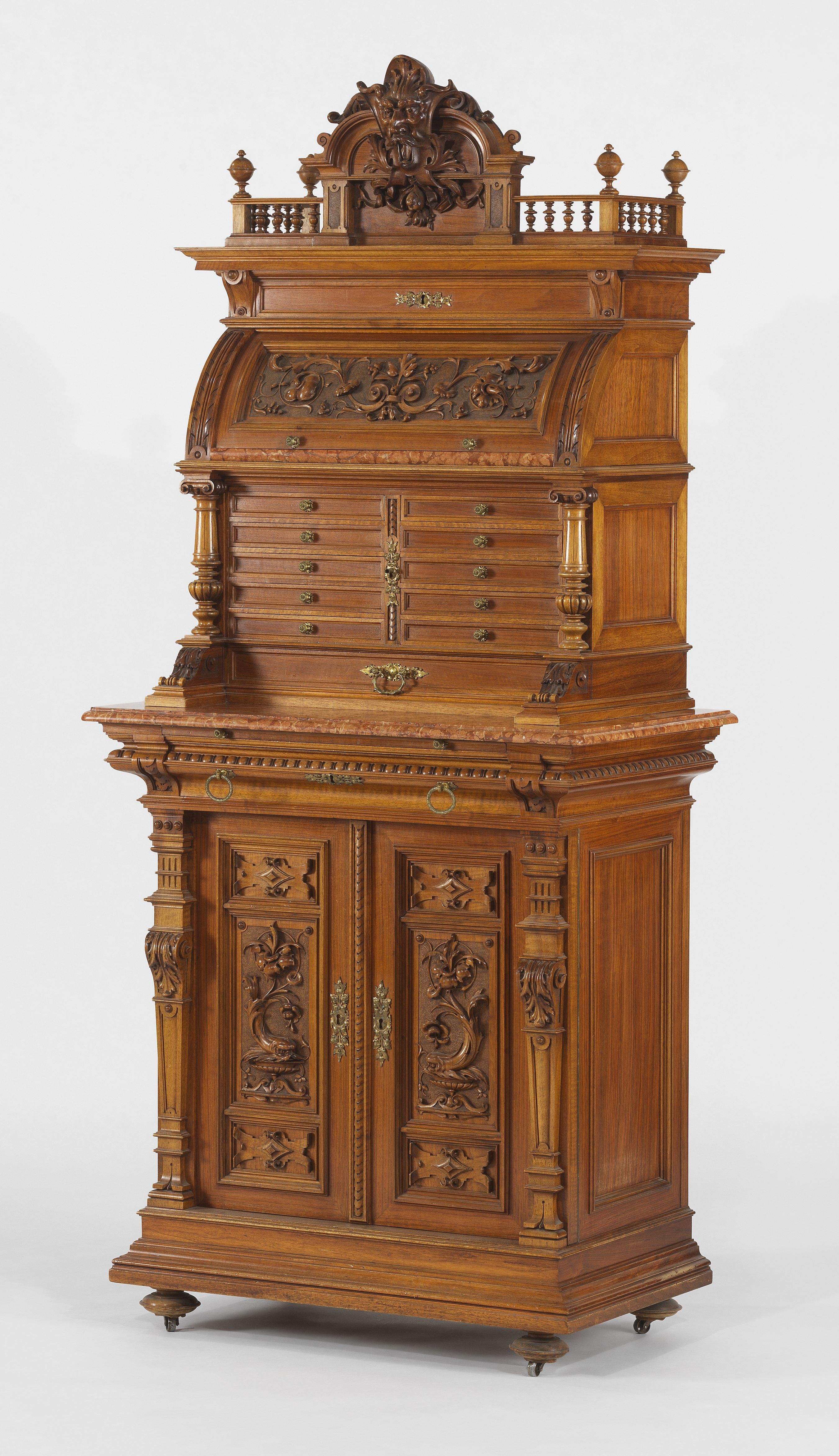 Nombreux tiroirs, cylindres et vantaux, noyer à décor sculpté de...
