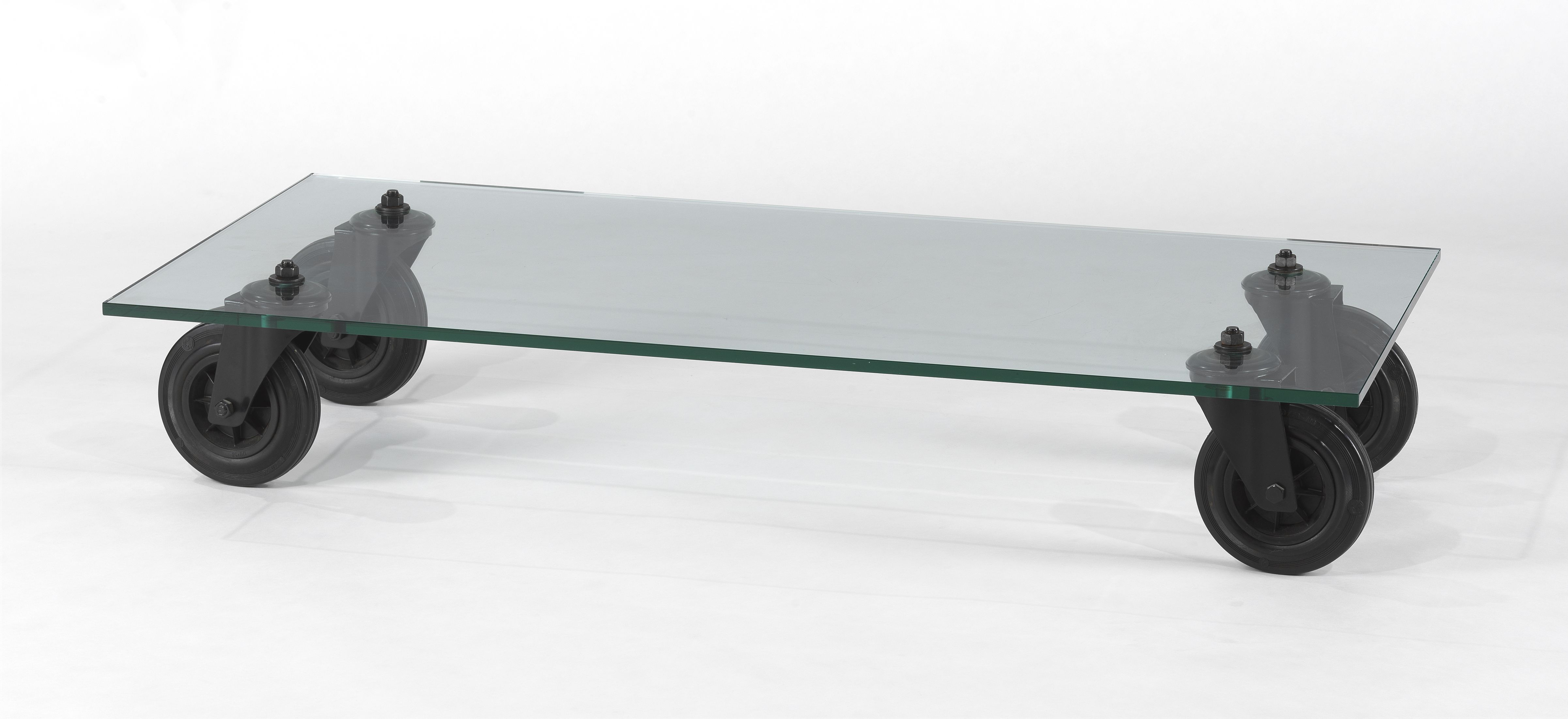 Métal laqué noir, caoutchouc et verre incolore posé sur quatre g...