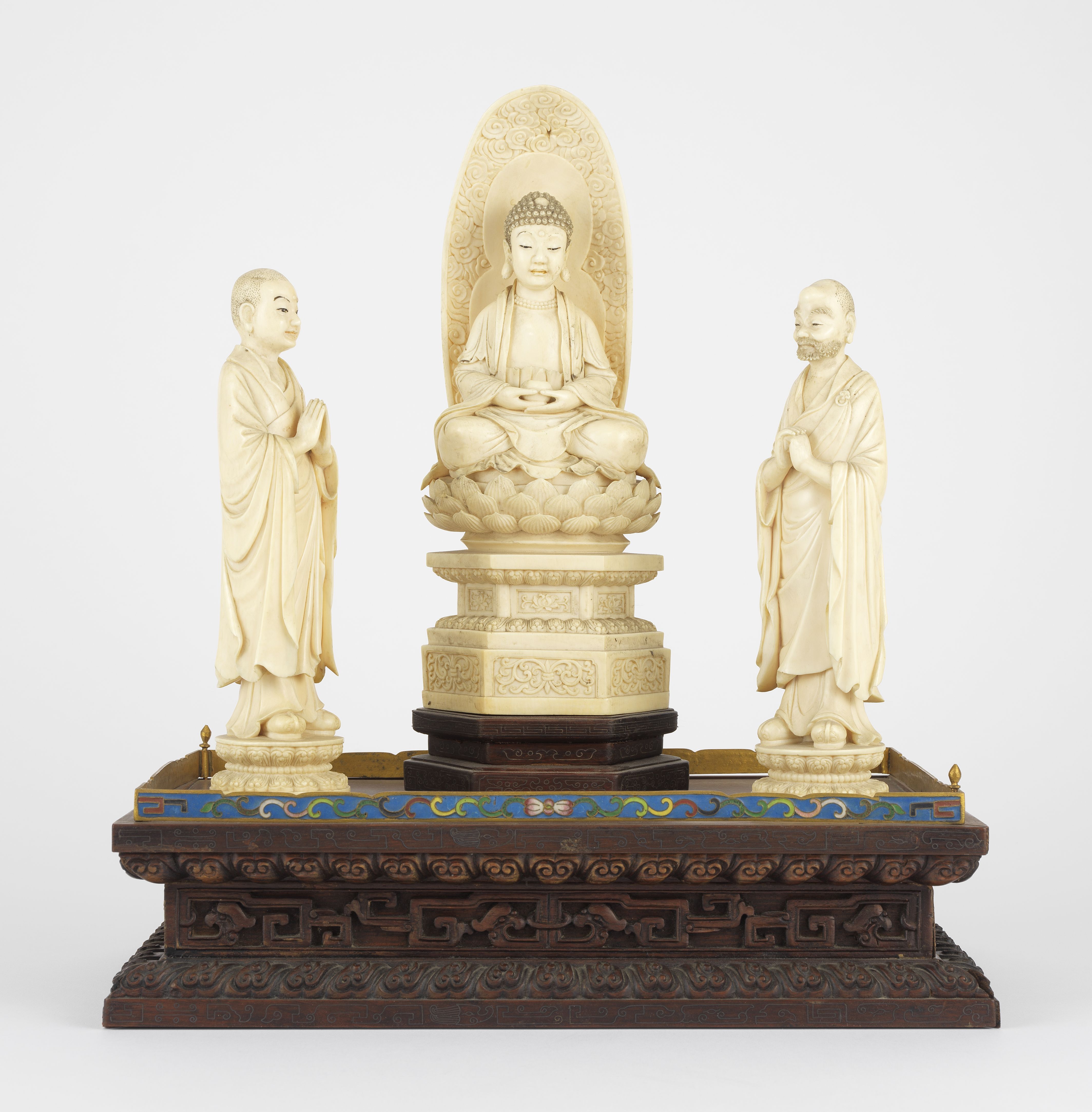 5043. Autel religieux surmonté d'un bouddha et de deux moines, Chine o...