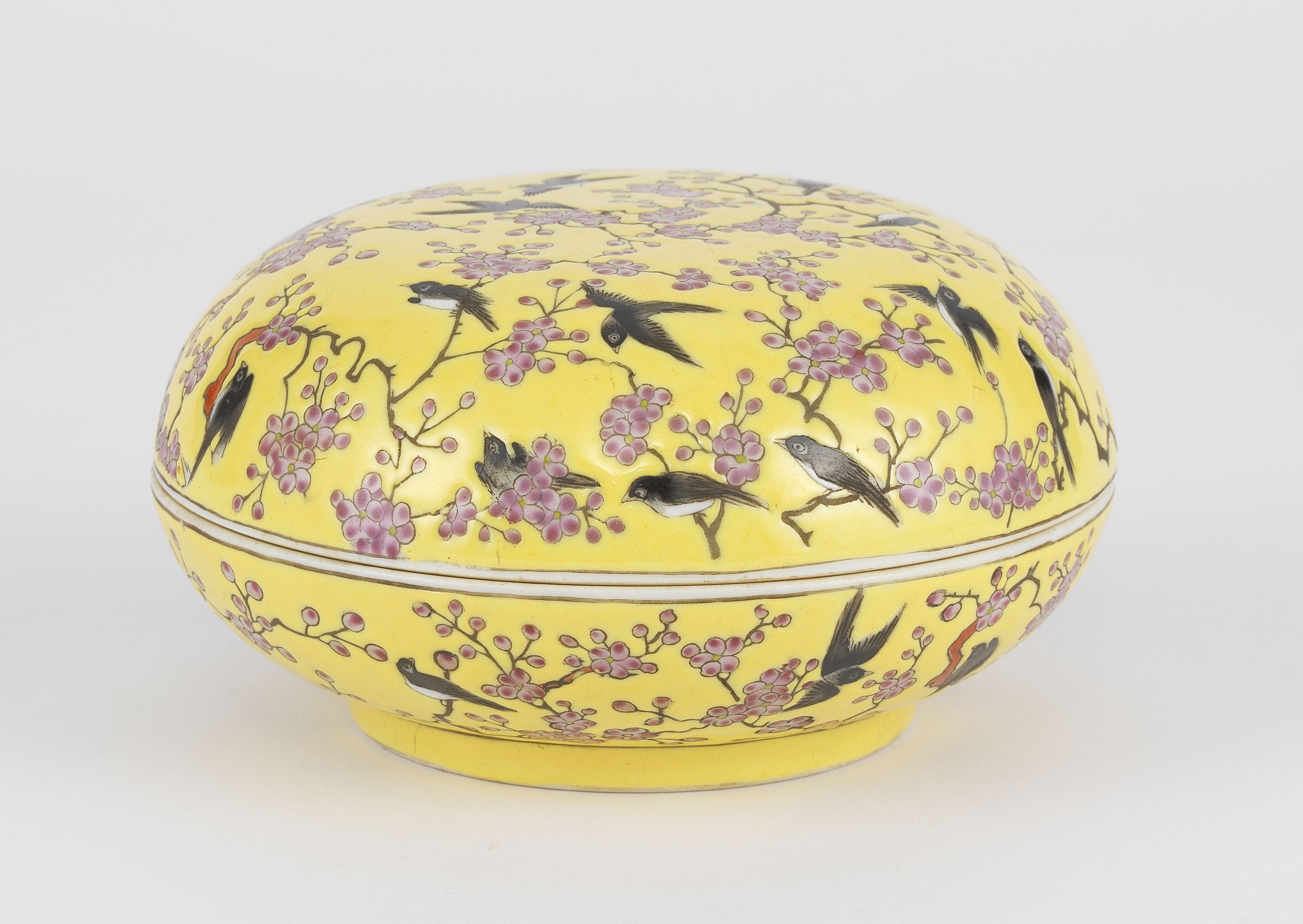 5006. Boîte ronde à décor Hua Niao sur fond jaune, Chine, XX e s