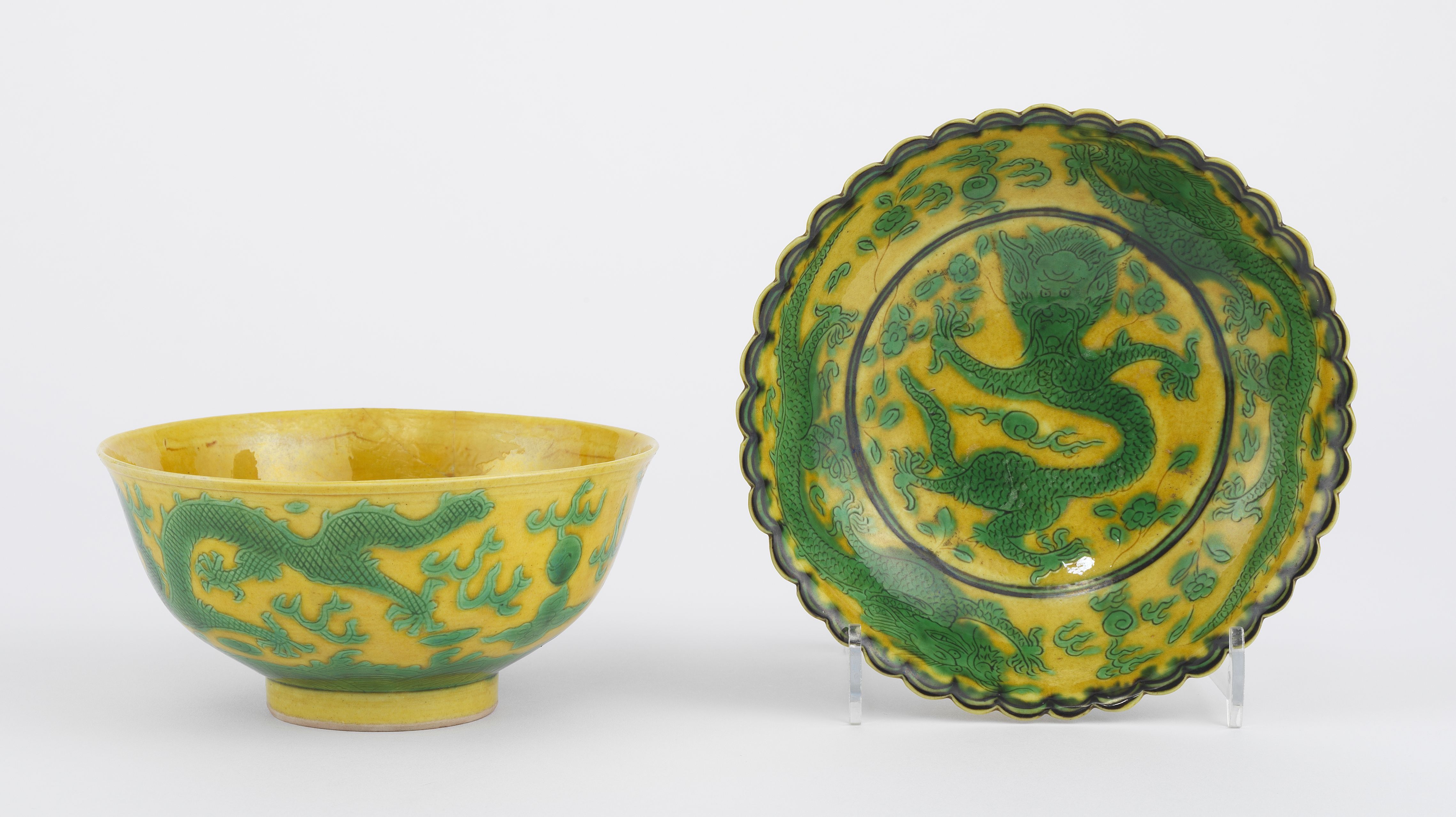 Porcelaine émaillée verte sur fond jaune à décor de dragon, D 12...