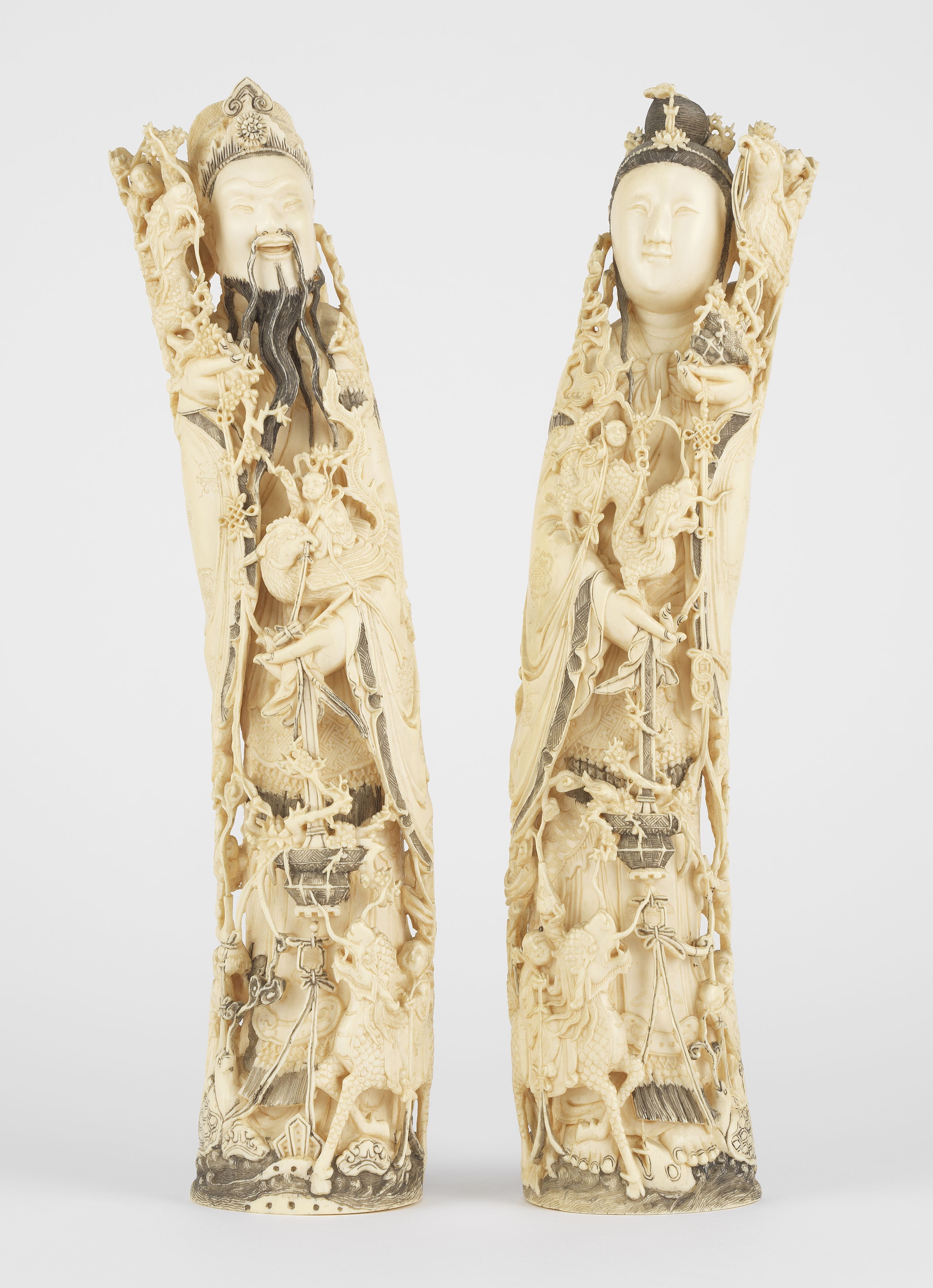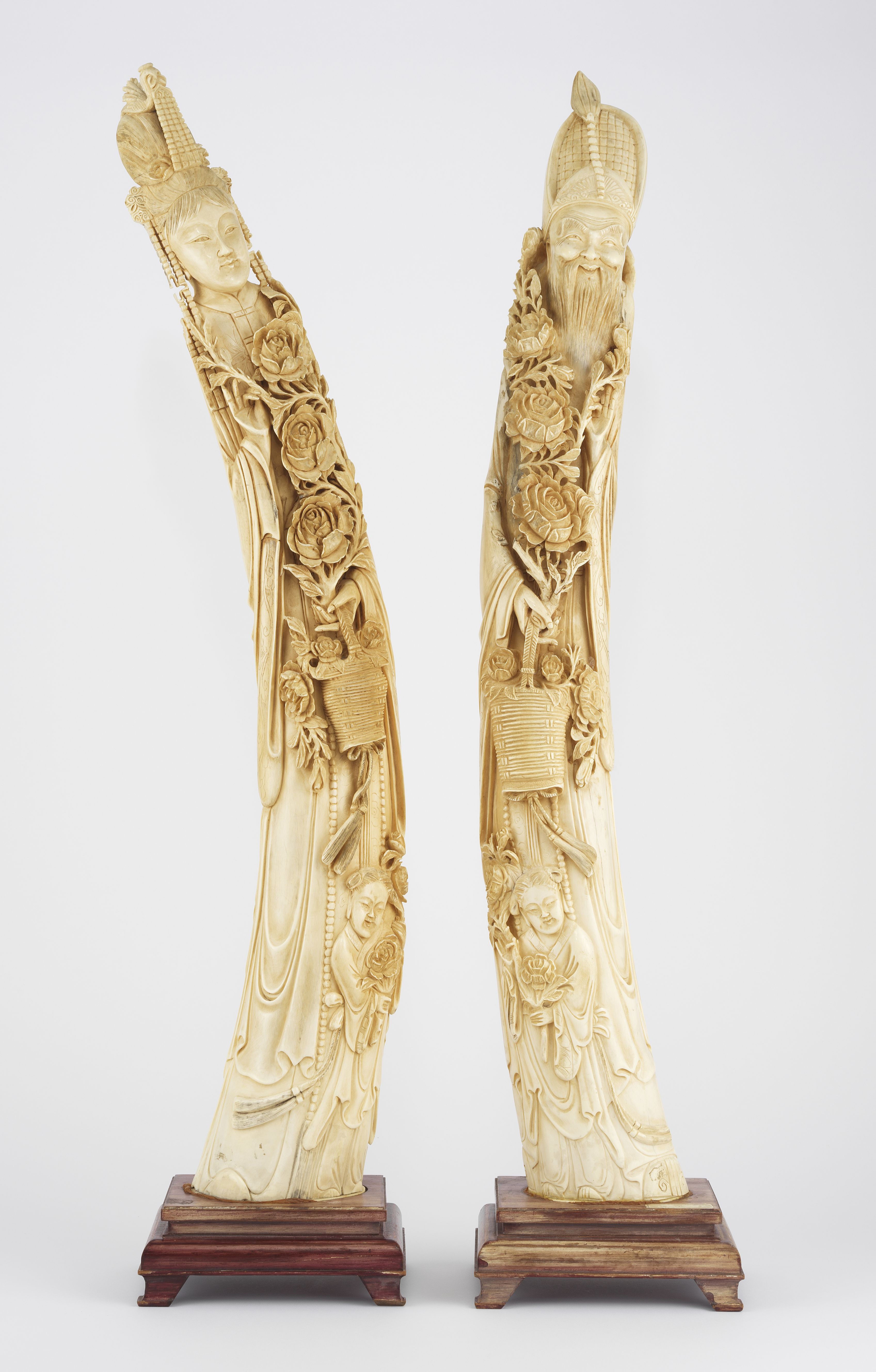 Ivoire sculpté, H 86 et 86,5 cm, D base: 34 cm