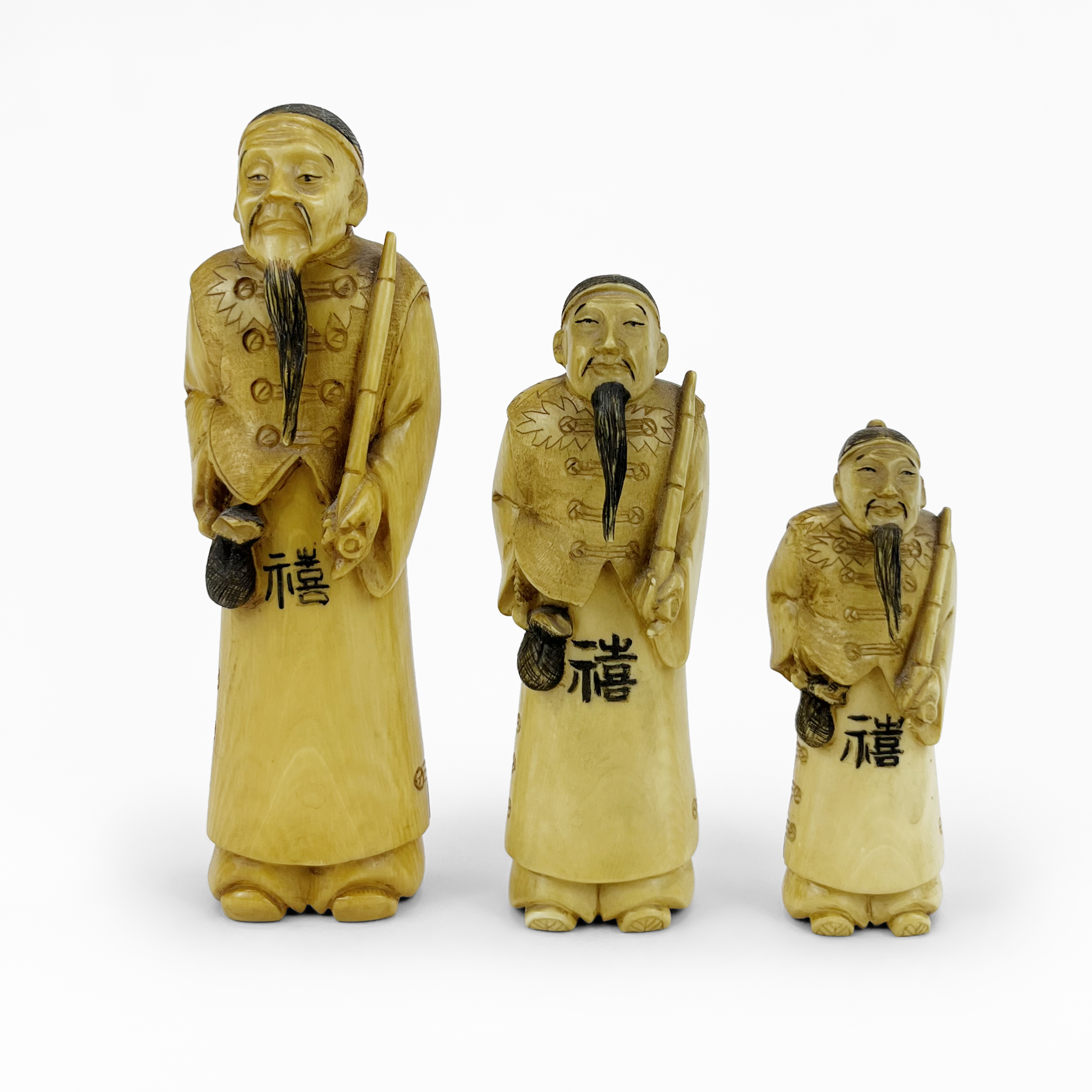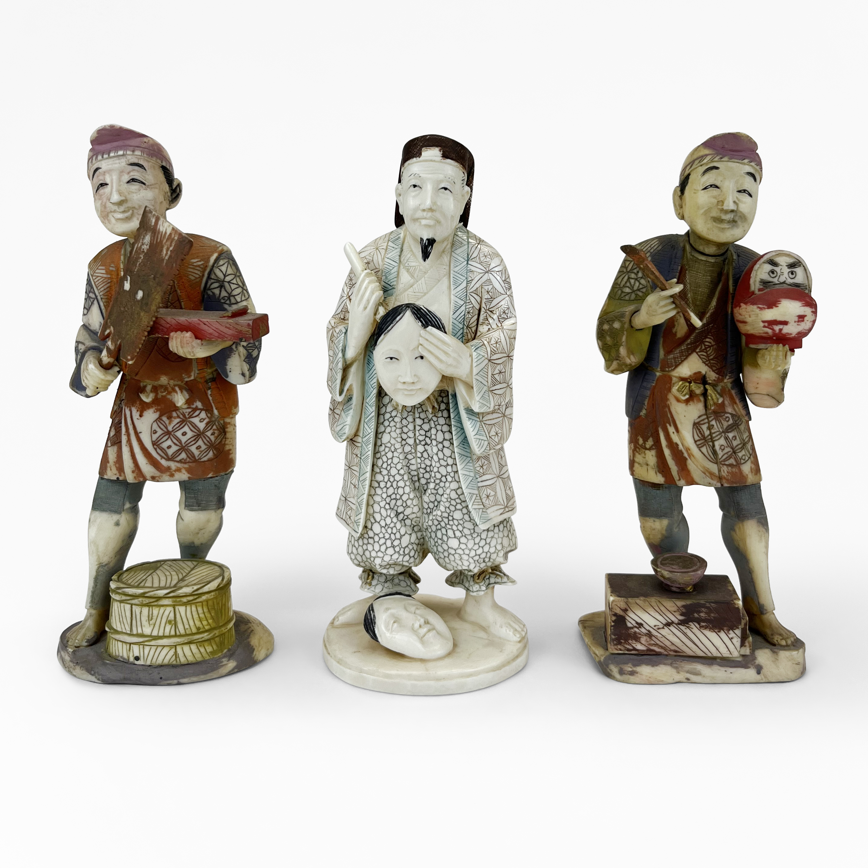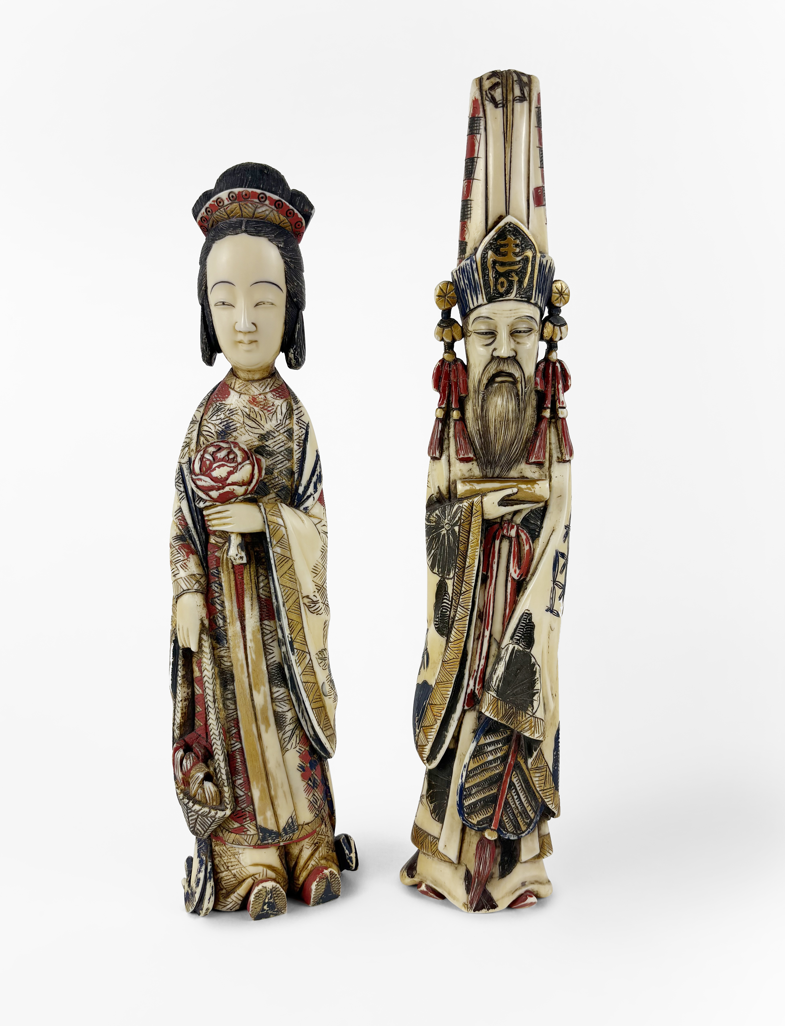 Ivoire sculpté polychrome, H de 28 et 31 cm