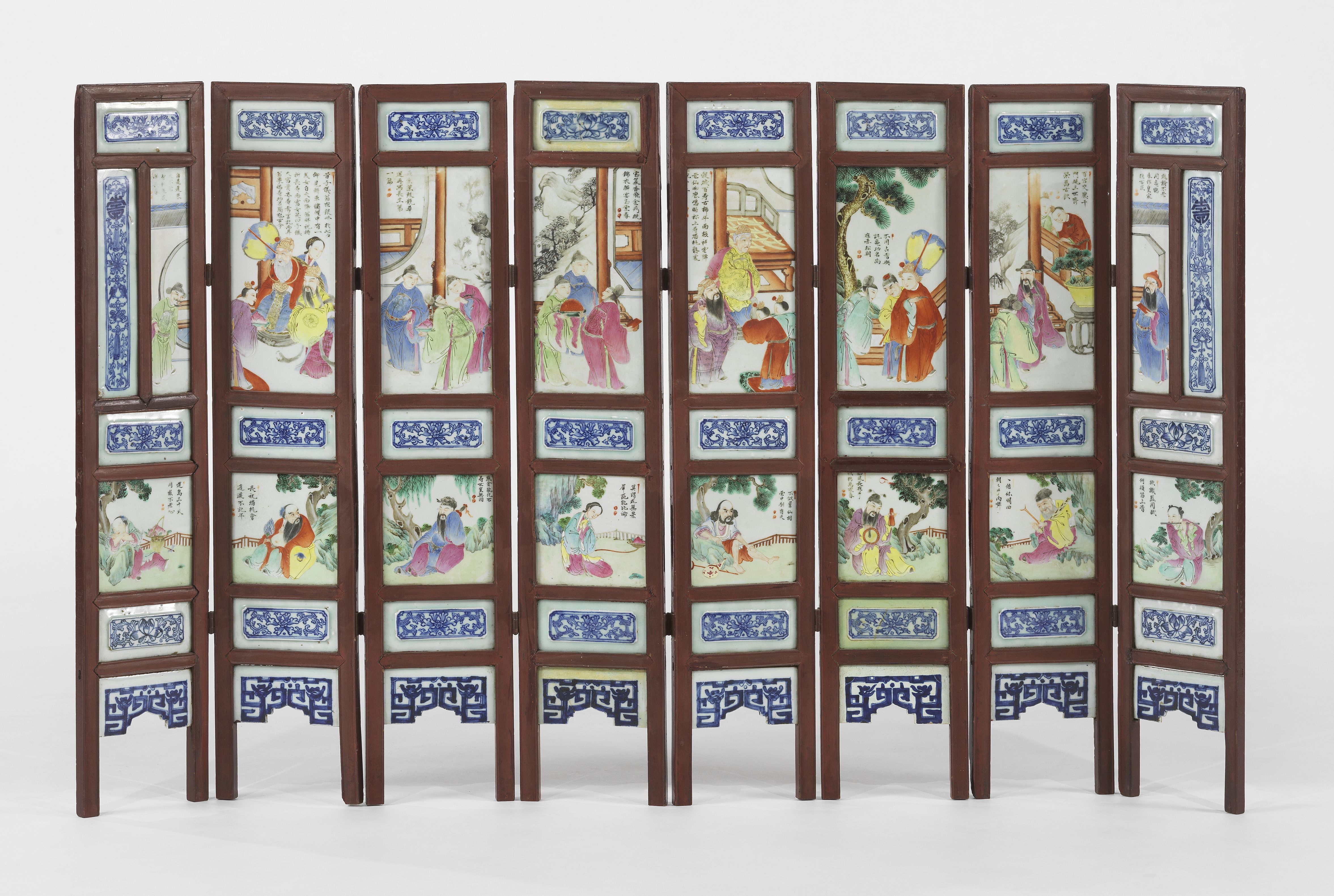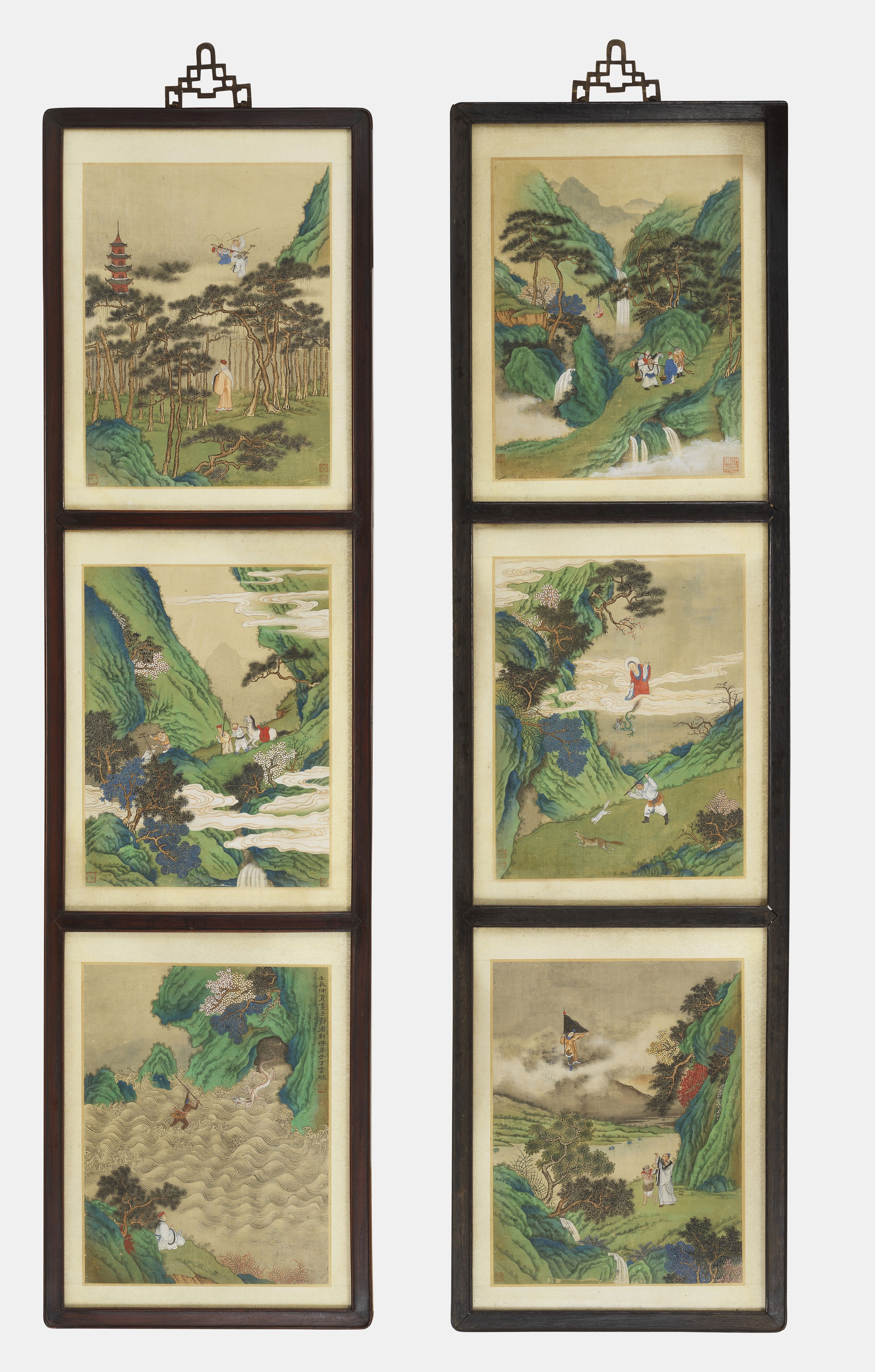 Suite de 6 scènes en soie peinte à décor de scènes animées, marq...