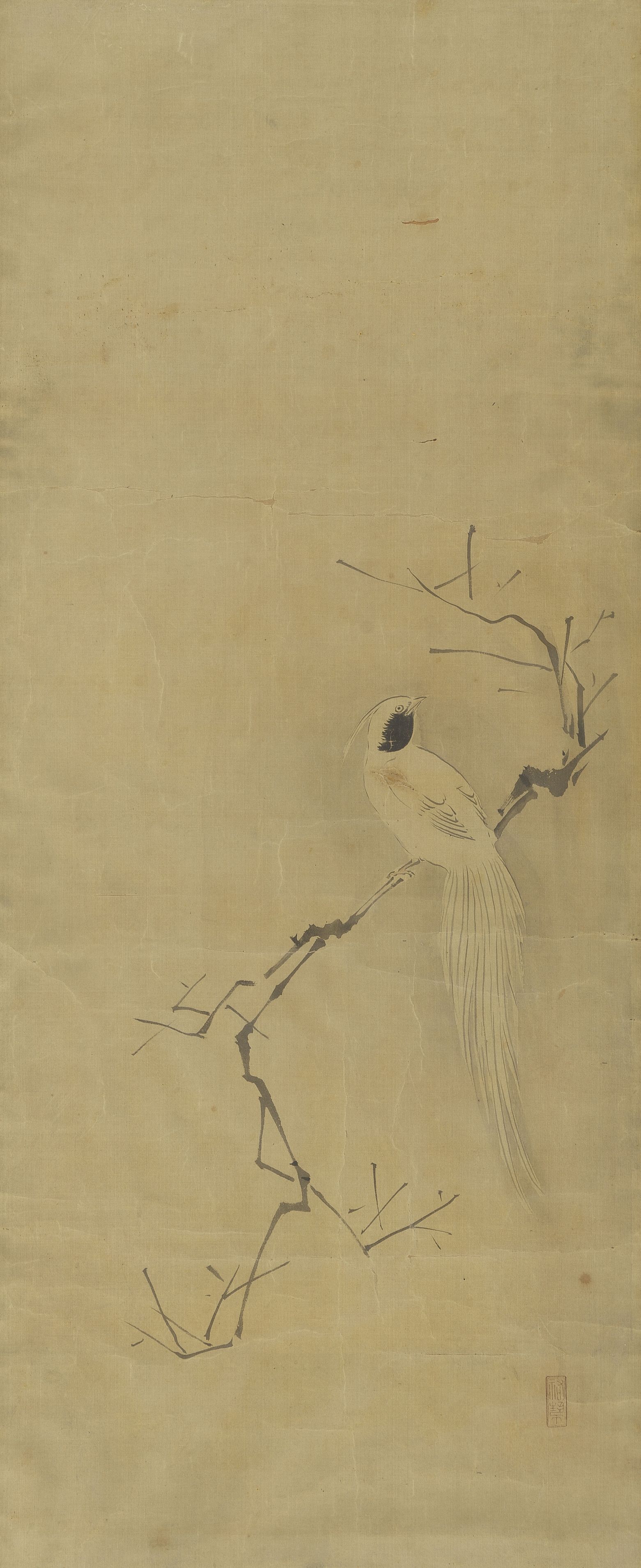 Oiseau posé sur une branche, encre et aquarelle sur papier, marq...