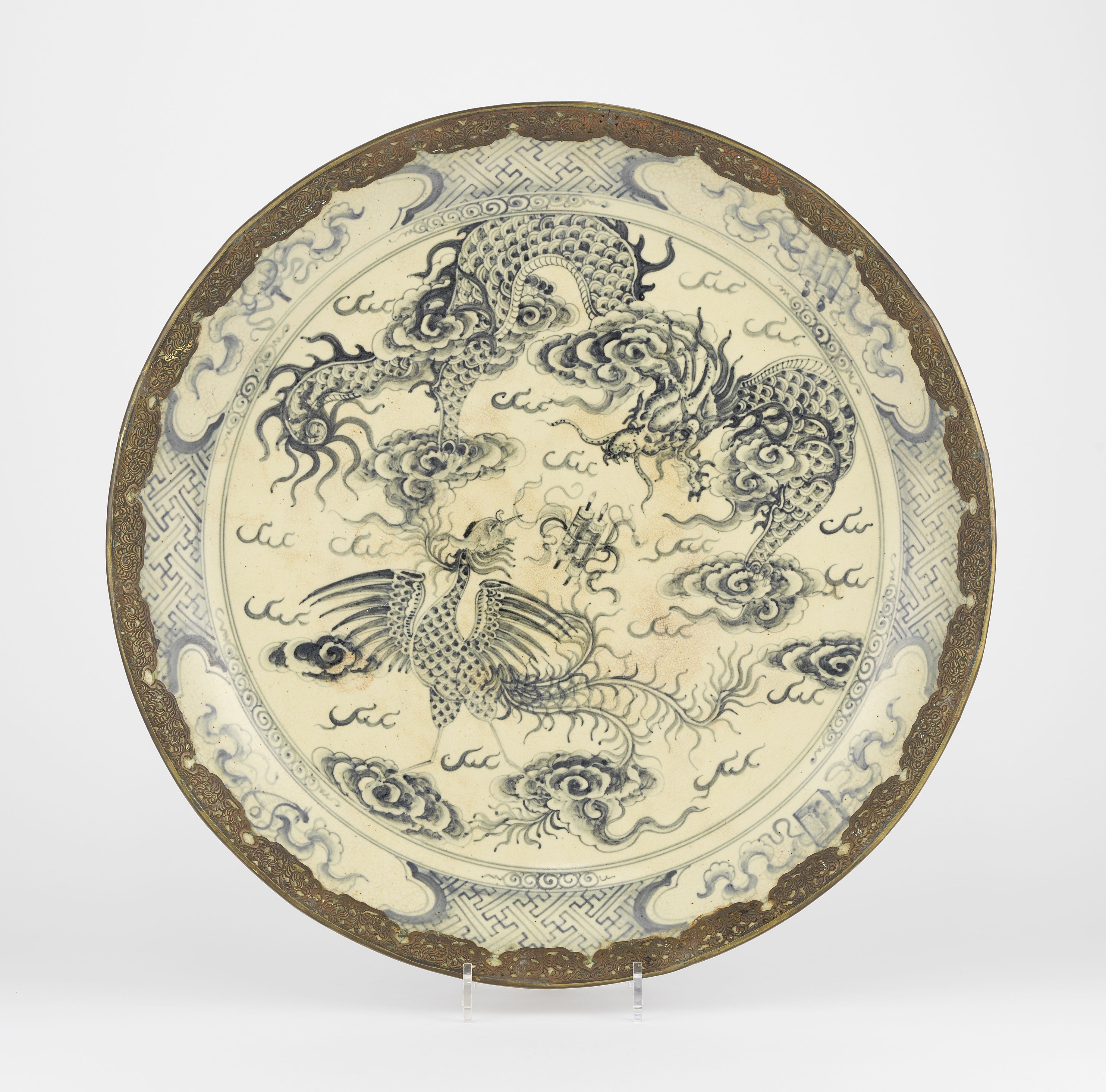 Porcelaine bleu blanc à décor d'un dragon et une phénix dans le...