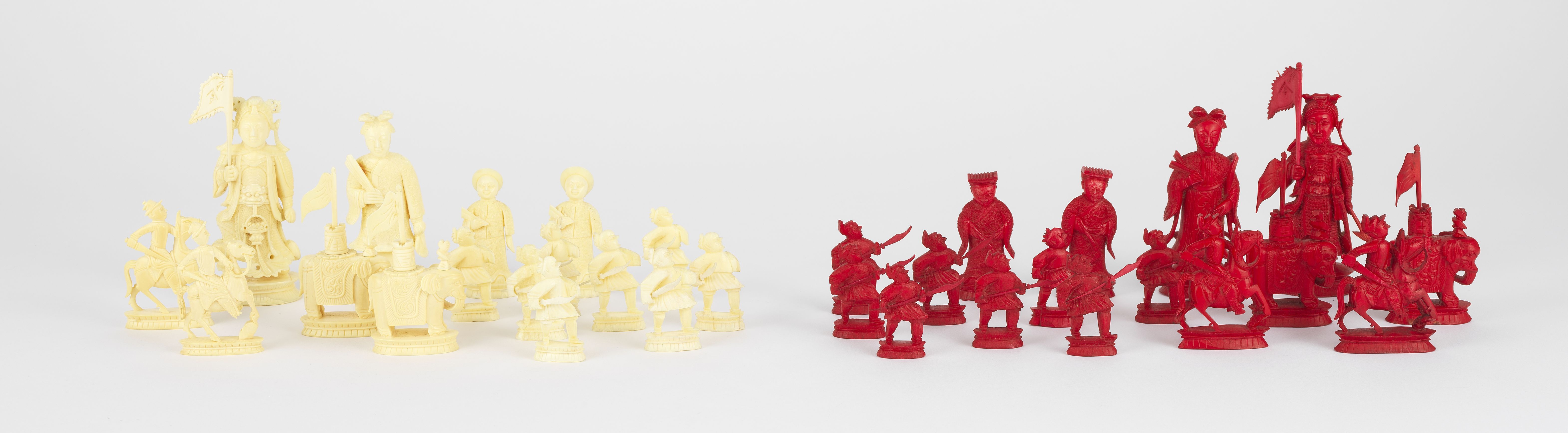 Pions en ivoire, coffret en bois laqué noir et or, 27x54 cm