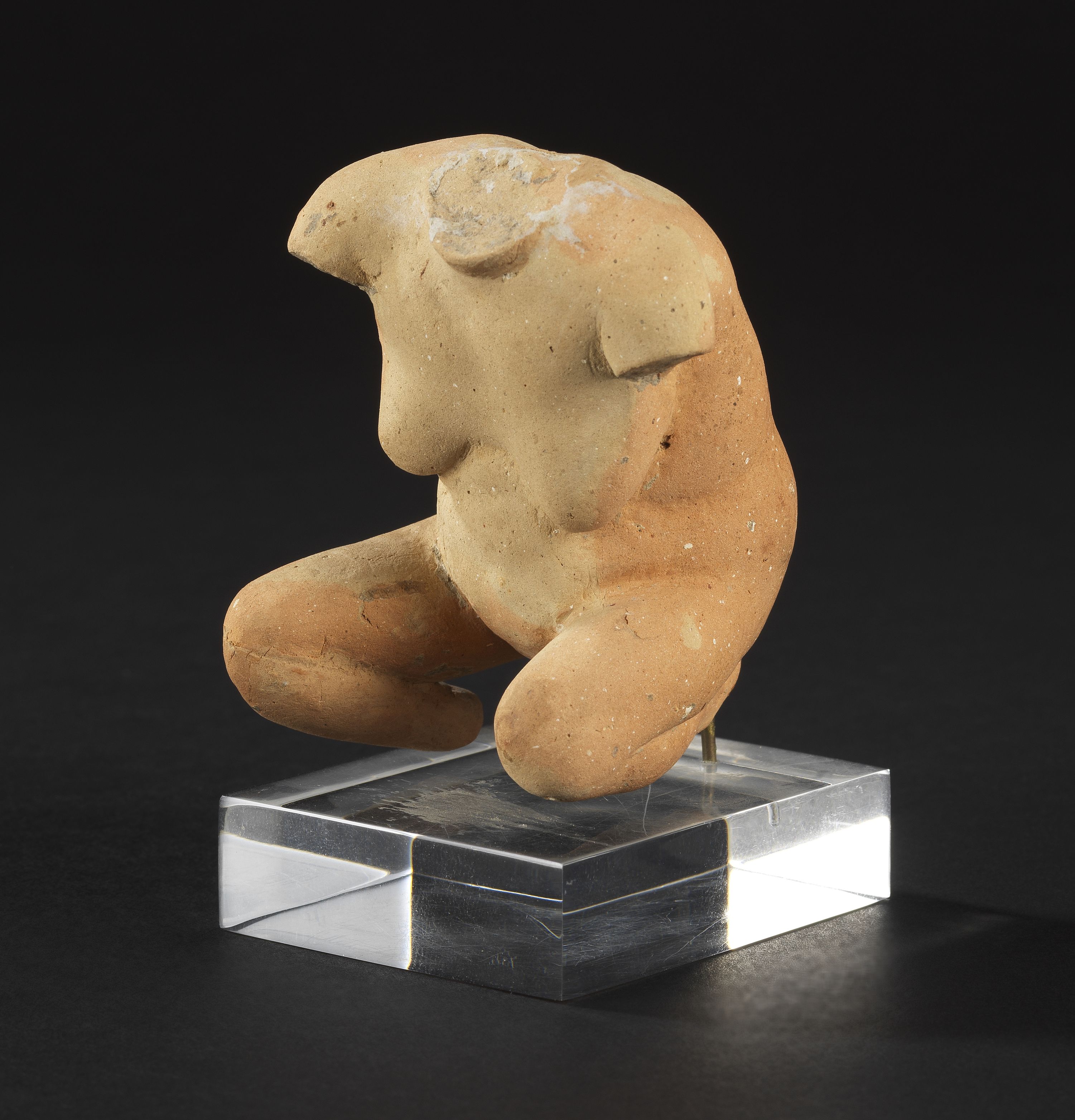 Les bras repliés sur les seins, terre-cuite beige, H 5,8 cm. Col...